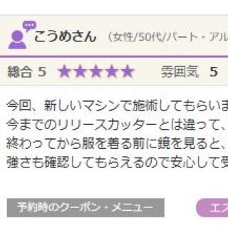 今回、新しいマシンで施術してもらいました。 今までのリリースカッターとは違って、即効性があるように思います。 終わってから服を着る前に鏡を見ると、今までなかったくびれができていて嬉しくなりました! 強さも確認してもらえるので安心して受けるこ...