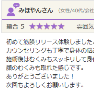 初めて筋膜リリース体験しました。 カウンセリングも丁寧で身体の悩みもしっかり聞いて下さって良かったです。 施術後はむくみもスッキリして身体が軽くなったのを実感出来ました。次の日に母に会ったら顔がスッキリしてると言われて 顔のむくみも取れた感...