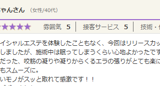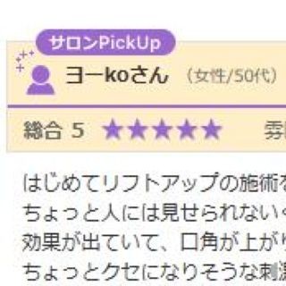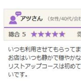 いつも利用させてもらってます。 お店はいつも静かで穏やかな空気の中施術していただいているのでとてもリラックスできます。 リストアップコースは初めてでしたが、終わったあといつもより顔のお肉の位置が上がっているような気がしました。しばらく続けて...