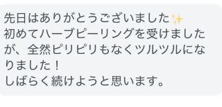 先日はありがとうございました。初めてハーブピーリングを受けましたが全然ピリピリもなくツルツルになりました!しばらく続けようと思います。 ハーブピーリングコース