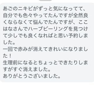 あごのニキビがずっと気になってて、自分でも色々やってたんですが全然良くならなくて悩んでたんですが、ここはなさんでハーブピーリングを見つけて少しでも良くなればいいなと思い予約しました。一回で赤みが消えてきれいになりました!生理前になったらちょ...
