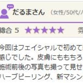今回はフェイシャルで初めて新マシンでの施術をしていただきました。パックやピーリングの気持ち良さとは違い、痛気持ちいい~という感じでした。皮膚にももちろん効いているけど、骨にまで凄く効いてる感じがしました。癖になりそうな痛さです。 施術前後の...