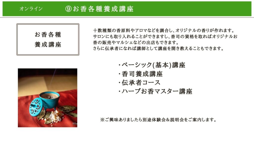 | 講座料金 | 1講座 90分 ¥33,000(税込) こちらは定価となります。 当日、セット割引きもありますので お問い合わせください。 サブスクか一つの講座を一括払いかをお選びください。 どちらも1つの養成講座分をいただきます。 分割もできます。ご相談ください。 最終試験&修了証 別途¥10,000 |