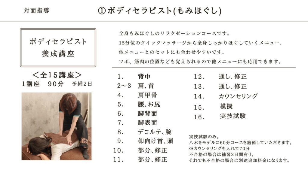 ・ボディ、フェイシャル、リフレクソロジーなど実際にここはなで施術をしている【すぐに実践できる】プロの技術をトータルで学べる