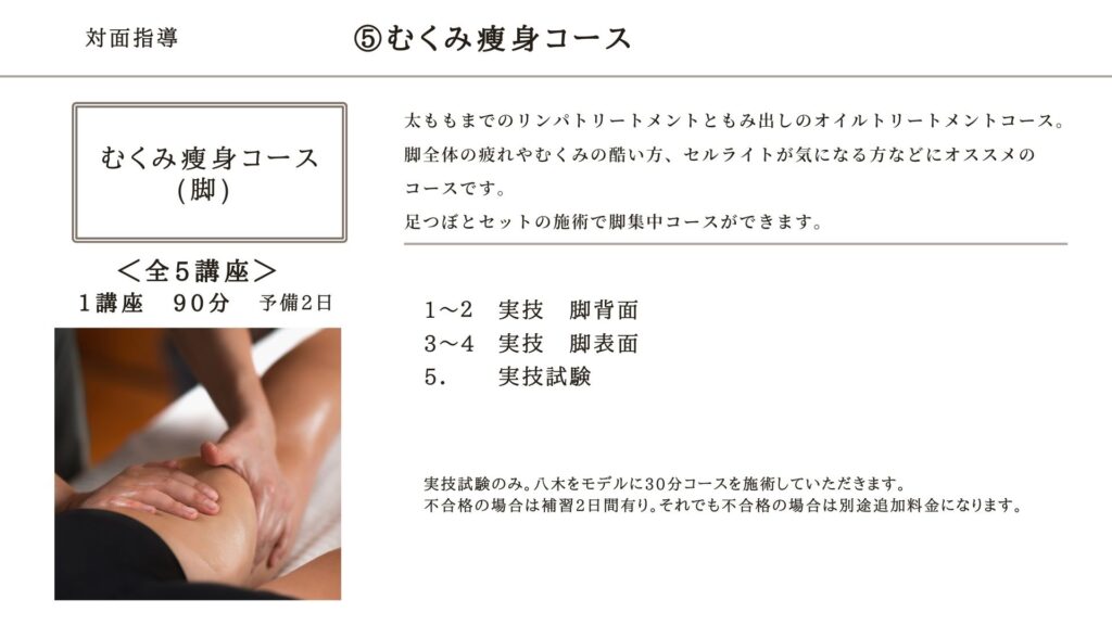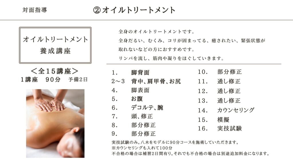 また、ツボの位置や筋肉なども覚えられるのでトリートメントの前に学ぶとオイルメニューでもアプローチが変わってきます。
