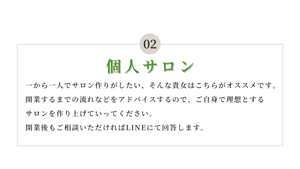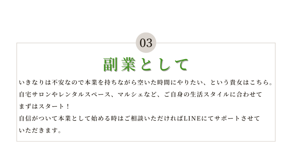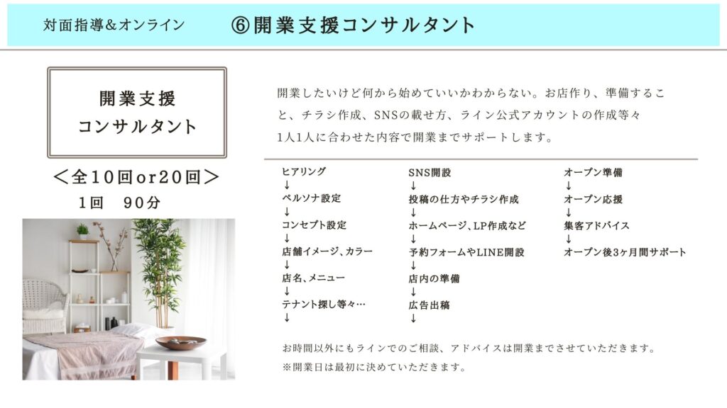 ・どんなサロンを開きたいのか、副業としてどのようにお仕事をしていきたいのかをお聞きしながら【思い描いているサロン】開業に必要な準備などをアドバイス