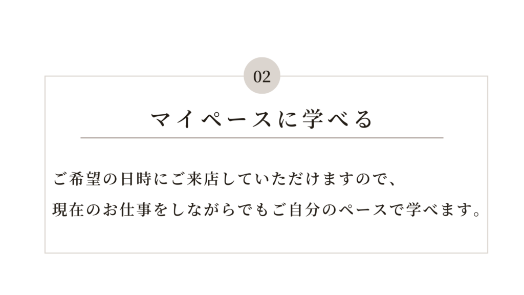 ・マンツーマン指導なのでご都合の良い日時で通えるので【効率的に集中して】仕事をしながらマイペースに通える