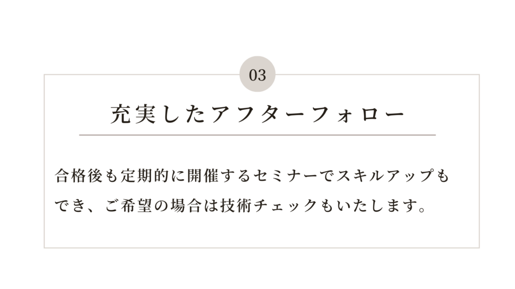 また、サロン経営は孤独になりがちですが卒業してからも定期的に情報共有しながら悩みなどの相談や困ったことなどの質問もできます。