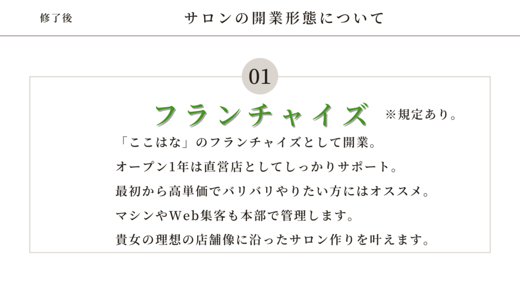 最初に自宅兼でサロンを開いた時、見本にしたのがフランチャイズとしてのやり方でした。